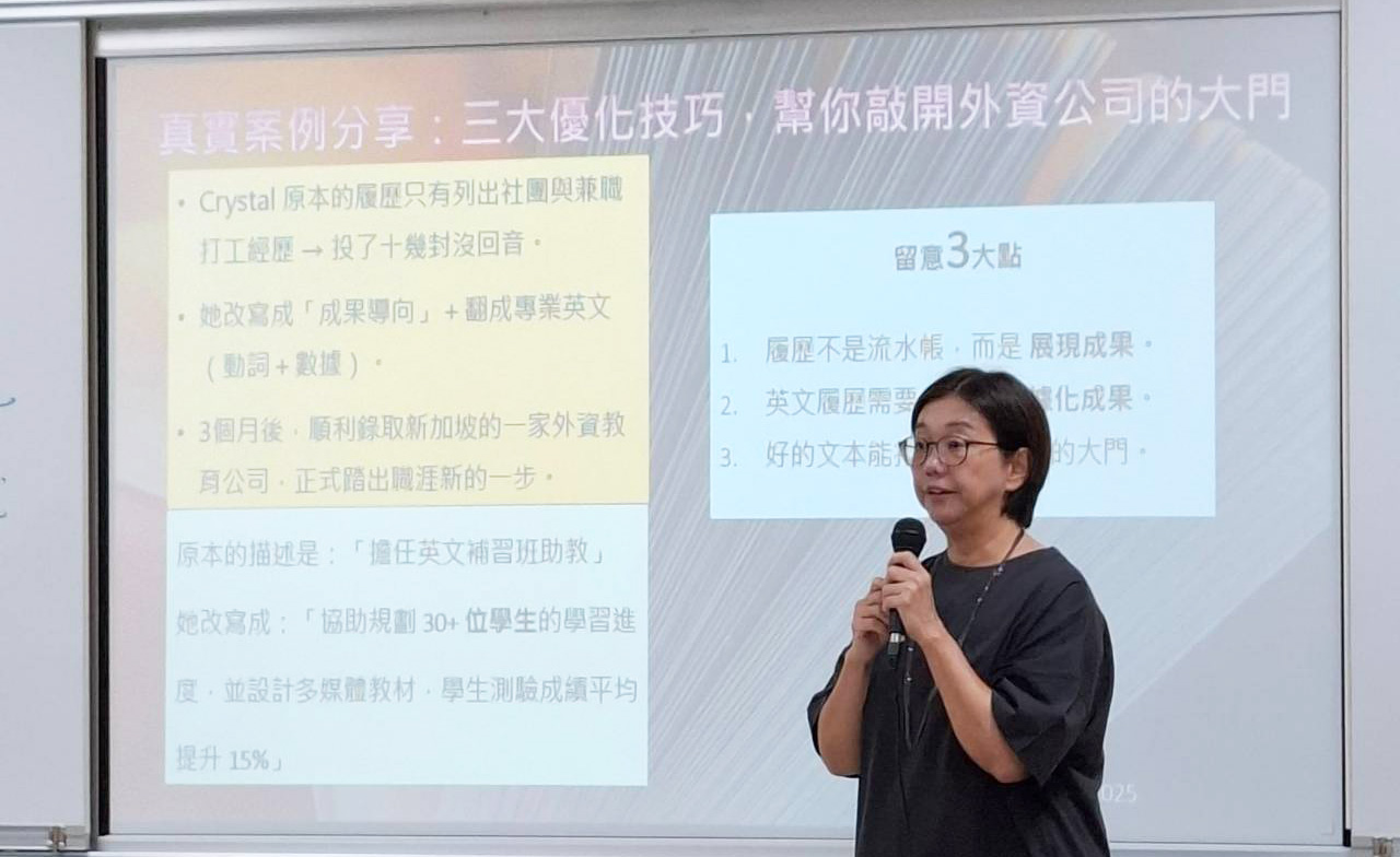 本次課程結合理論與實務,透過實際案例分享與互動討論,期望能幫助學生習得專業的中英文履歷撰寫技巧,同時也促進學界與產業之間的深度連結。我們十分感謝校方在課程規劃、行政協調與現場安排上的專業與用心,使課程得以順利進行。