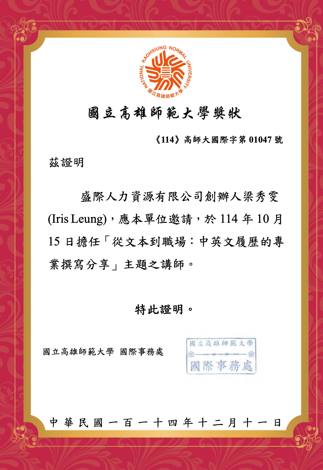 再次感謝國立高雄師範大學的信任與邀請!