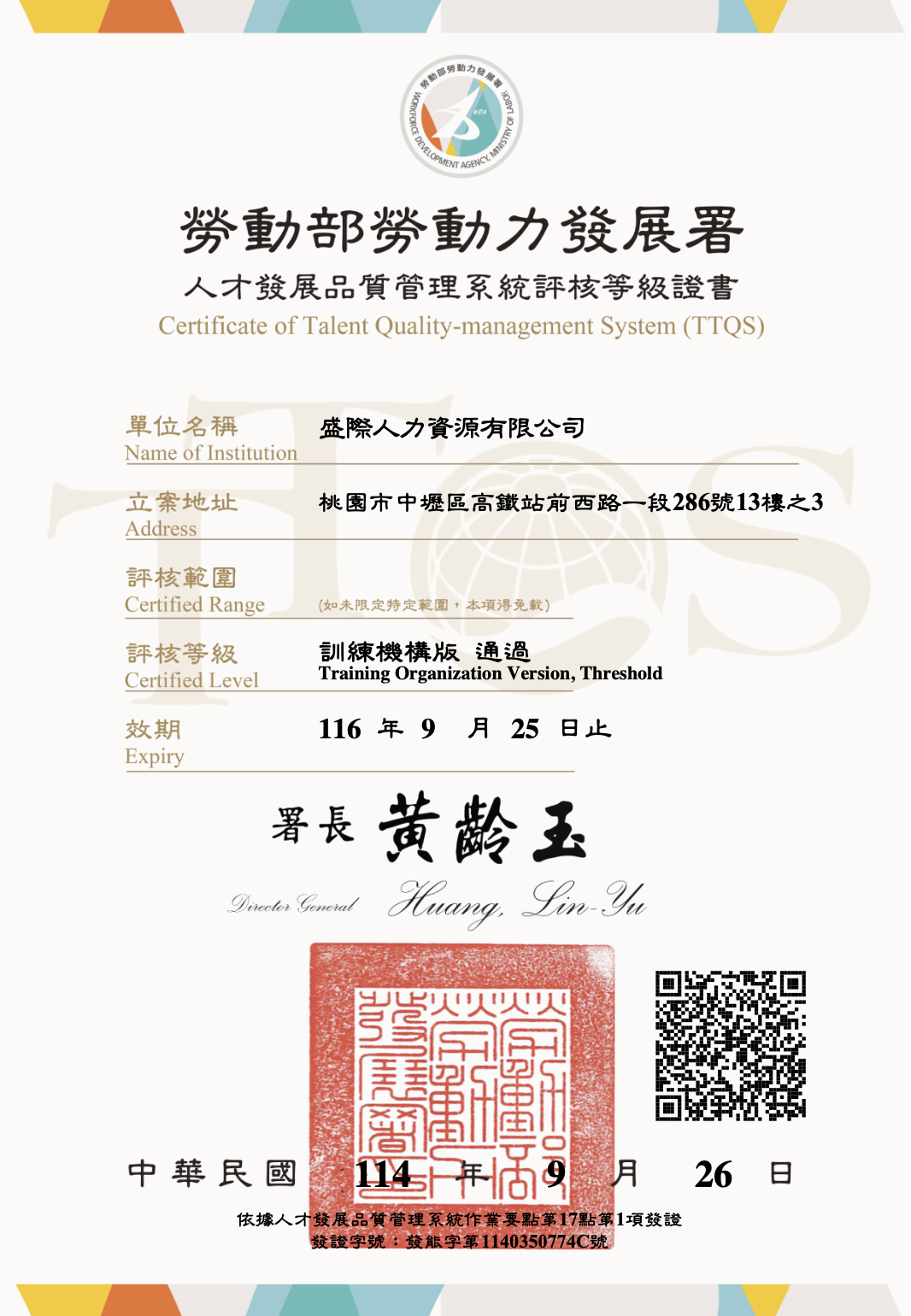 盛際 Prowess Services 將持續秉持 人才發展品質管理的專業精神,以誠懇踏實的態度推動教育訓練與職能培育,致力於建構具國際視野的人才庫,讓更多人才在學習與成長中展現潛能,共同創造屬於未來的專業價值與卓越成果。